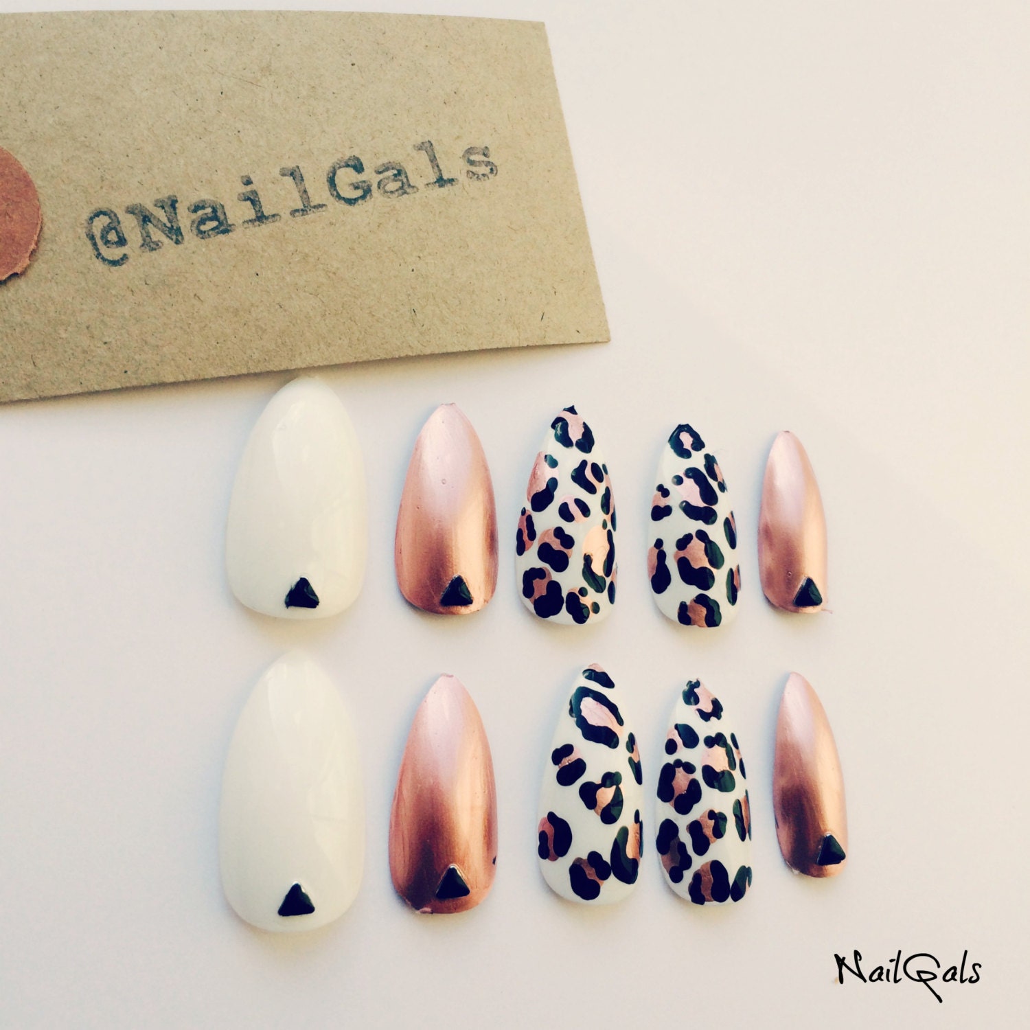 Chrome Rose and White Leopard Print stiletto nails set - Nail Art - Nail Designs- False Nails- Acrylic Nails - Fake Nails