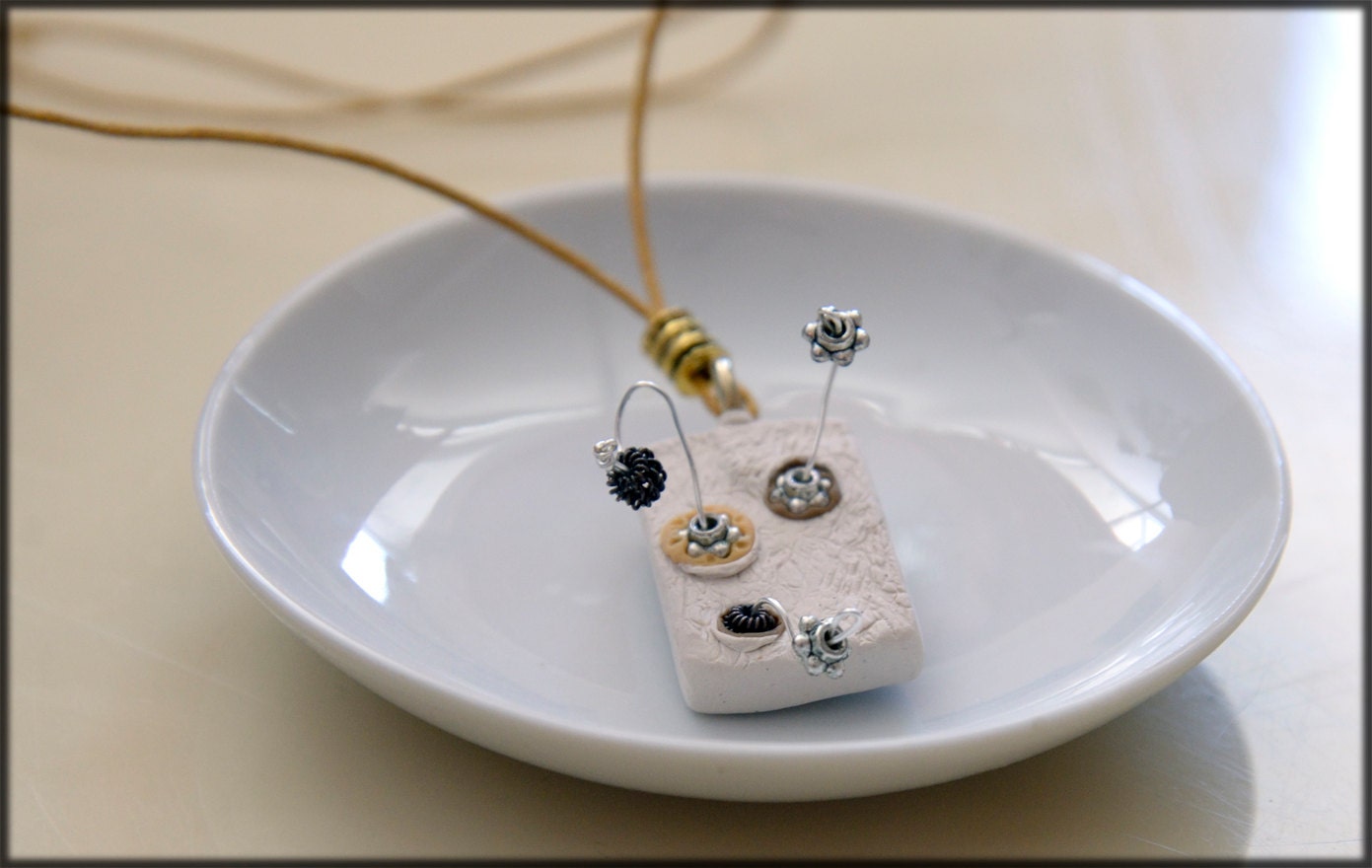 Surreal Popping Flower Polymer Clay and Bead Textured Art Pendant Cream Brown Mustard Yellow
