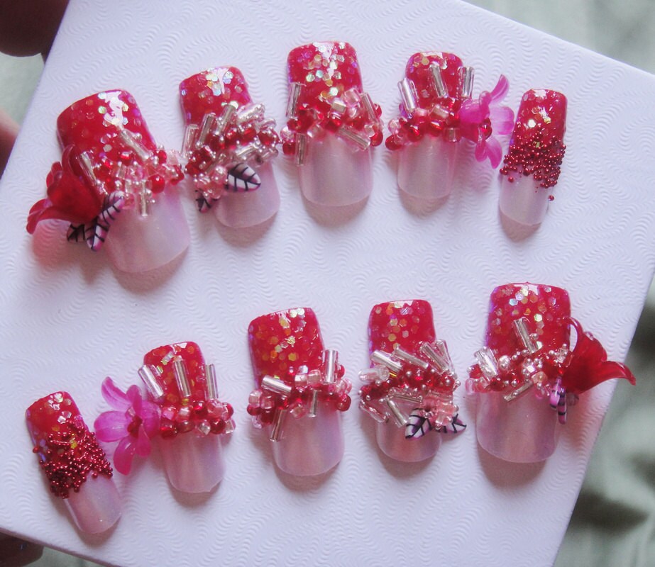 3D Kawaii Nail Art-Designs Set Red Glitter Beads with Flower leaf