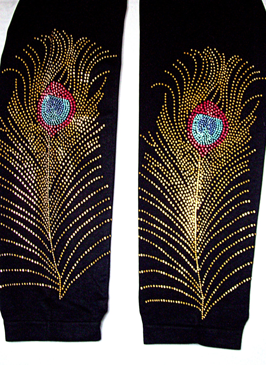 Plus Size Leggings Embellished Gold Red Stud Peacock Feather Design