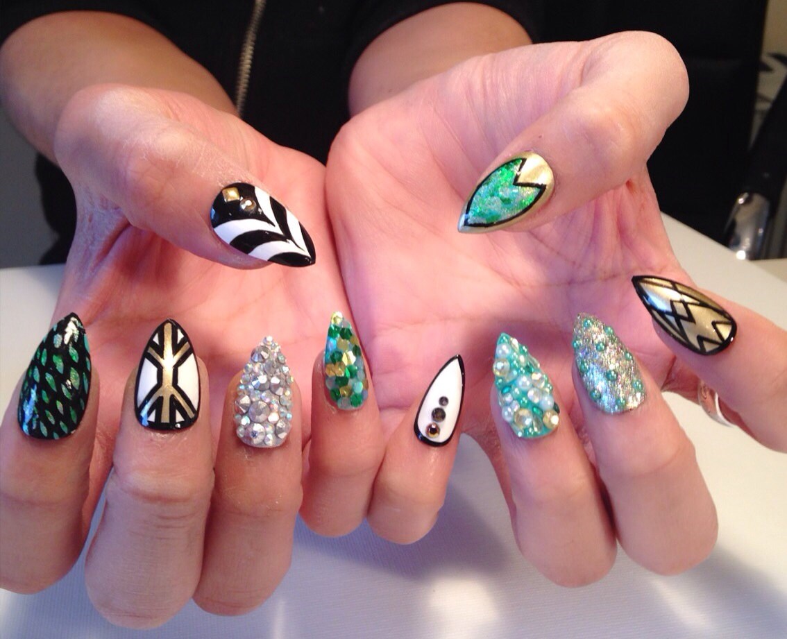 Hand made and painted to order emerald stiletto false nails by magnailfy