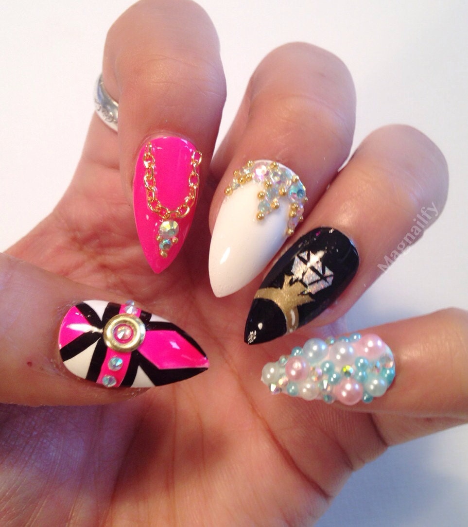 Hand painted diamond and pearls stiletto false nails