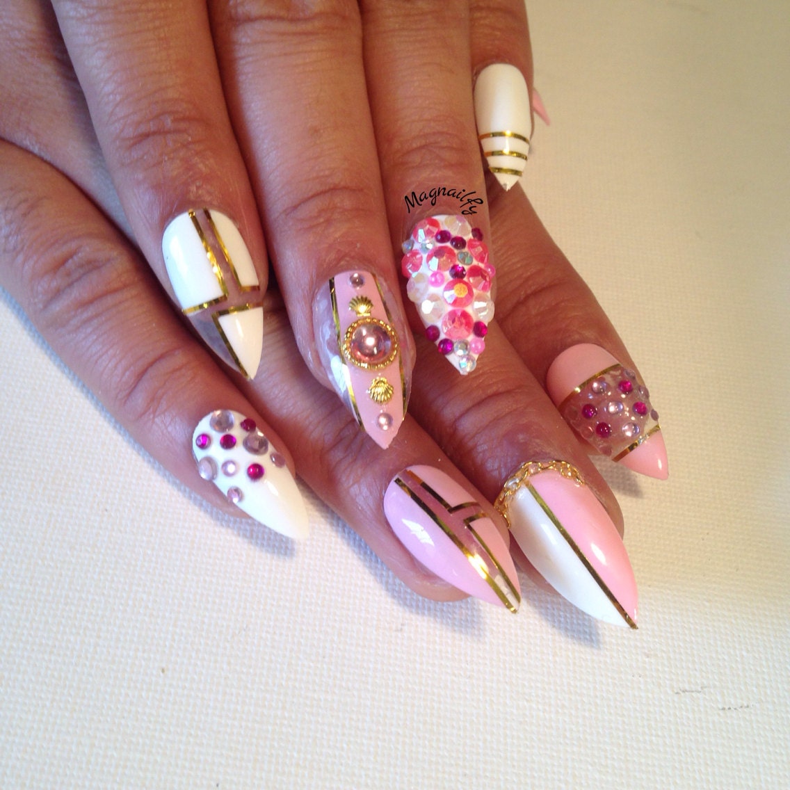 Hand painted to order 10 different pink and whit stiletto false nails by magnailfy